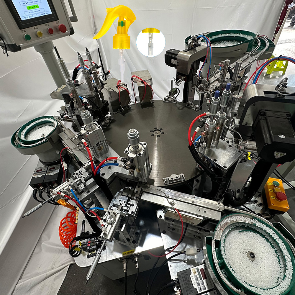 The spray bar and the spray head are transported and arranged neatly through the vibration plate. The robot grabs the spray bar and puts it into the disc, then grabs the spray head and inserts it into the spray bar. The vibration plates on both sides transport the spray pieces to the straight vibration belt. The robot grabs the spray pieces in turn and inserts them into the assembled spray bar, and finally completes the assembly of the three-piece spray bar set.